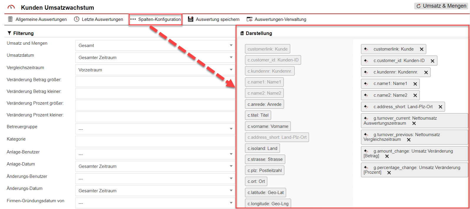 Über den Button „Spalten-Konfiguration“ [Abb. 2/5] ist es möglich, die Auswertung sowie den Umfang der Informationen schnell und einfach nach den eigenen Wünschen anzupassen [Abb. 4]. Mit nur wenigen Mausklicks lassen Sie Spalten aus der Anzeigemaske verschwinden oder fügen andere hinzu.