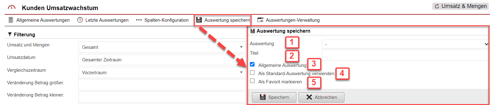 Über die Schaltfläche „Auswertung speichern“ kann man die konfigurierte Auswertung für die Zukunft als Voreinstellung speichern, um auf diese schnell zugreifen zu können. Hierfür kann eine bereits vorhandene Auswertung durch Auswahl Ihres Titels aus einem Drop-Down-Menü überspeichert werden [Abb. 5/1]. Ebenso ist die Eingabe eines Titels machbar [Abb. 5/2], wodurch eine neue Auswertungskonstellation gespeichert wird. Über die folgenden Checkboxen sind genauere Konfigurationen, wie „Allgemeine Auswertung“ [Abb. 5/3] (Auswertungskonstellation für alle System-User nutzbar), „Als Standard-Auswertung verwenden“ [Abb. 5/4] und die Möglichkeit, die Auswertung als Favorit zu markieren gegeben [Abb. 5/5]. Über die Schaltfläche „Speichern“ können die Informationen gespeichert und über die Schaltfläche „Abbrechen“ wieder verworfen werden.